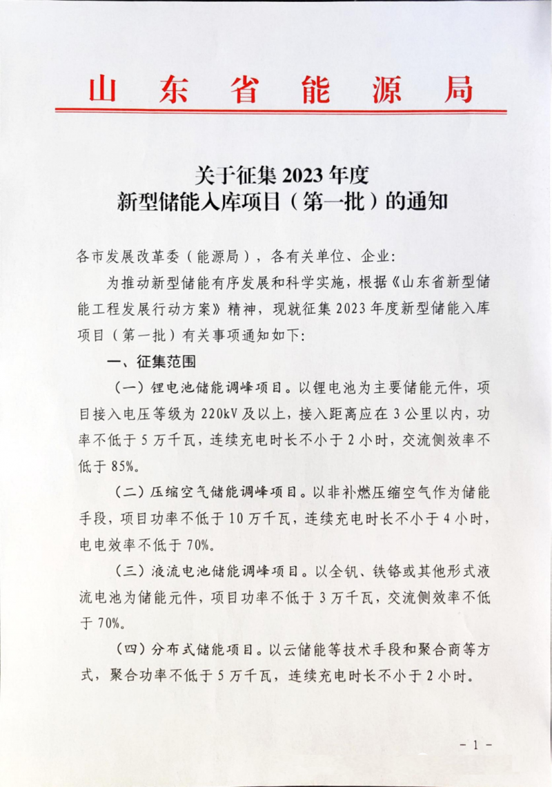 4月10日,山東省能源局下發(fā)《關(guān)于征集2023年度新型儲(chǔ)能入庫(kù)項(xiàng)目(第一批)的通知》(以下簡(jiǎn)稱《通知》)。