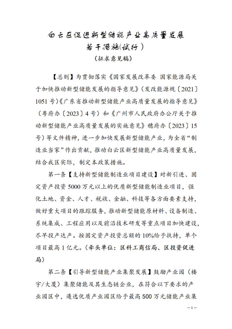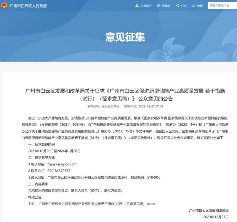 12月27日,廣州市白云區發展和改革局發布關于征求《廣州市白云區促進新型儲能產業高質量發展若干措施(試行)(征求意見稿)》(以下簡稱《征求意見稿》) 公眾意見的公告。