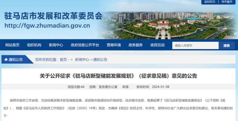 關(guān)于公開征求《駐馬店新型儲能發(fā)展規(guī)劃》(征求意見稿)意見的公告