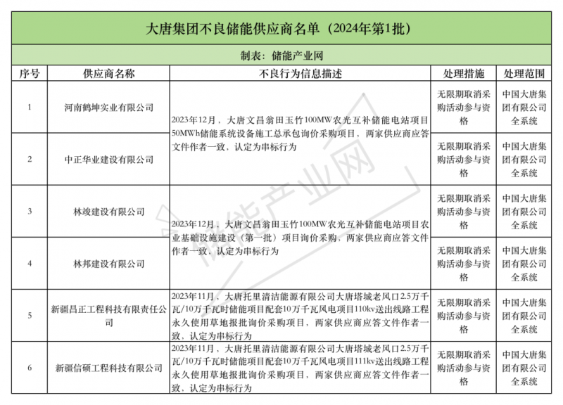 嚴重!3個儲能項目串標!6家企業被永久拉黑!2024年大唐首批儲能供應商黑名單公布!
