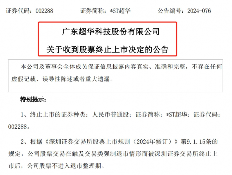 值得一提的是,8月5日,*ST超華公告稱,公司于2024年8月5日收到深圳證券交易所出具的《關于廣東超華科技股份有限公司股票終止上市的決定》,深交所決定終止公司股票上市。根據(jù)相關規(guī)定,公司股票觸及交易類強制退市情形,不進入退市整理期,將于深交所作出終止上市決定后十五個交易日內摘牌。