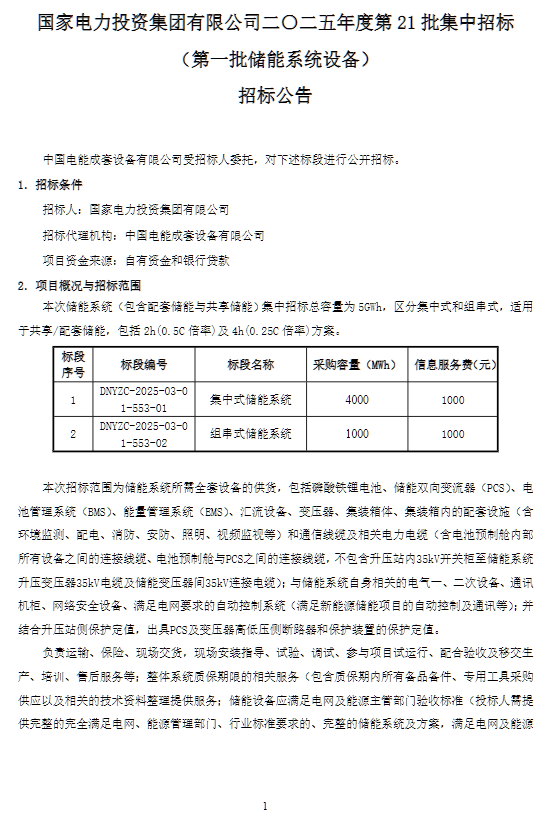 本次儲(chǔ)能系統(tǒng)(包含配套儲(chǔ)能與共享儲(chǔ)能)集中招標(biāo)總?cè)萘繛?5GWh,區(qū)分集中式和組串式,適用于共享/配套儲(chǔ)能,包括 2h(0.5C倍率)及 4h(0.25C倍率)方案。