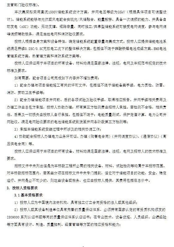 2)投標(biāo)人近三年(2022年 1月至今,以合同簽訂時(shí)間為準(zhǔn))國(guó)內(nèi)累計(jì)供貨業(yè)績(jī)不低于 8GMWh(合同業(yè)績(jī)單體項(xiàng)目容量不低于 5MWh,證明材料需包括合同首頁(yè)、關(guān)鍵參數(shù)頁(yè)、簽字頁(yè)),如業(yè)績(jī)?yōu)榭蚣芎贤?qǐng)明確簽訂使用容量否則不予計(jì)入累計(jì)合同業(yè)績(jī)。至少 5個(gè)單體項(xiàng)目容量 200MWh及以上的磷酸鐵鋰電化學(xué)儲(chǔ)能系統(tǒng)并網(wǎng)業(yè)績(jī)(證明材料需包括合同首頁(yè)、關(guān)鍵參數(shù)頁(yè)、簽字頁(yè),以及投運(yùn)證明或竣工驗(yàn)收證書等)。