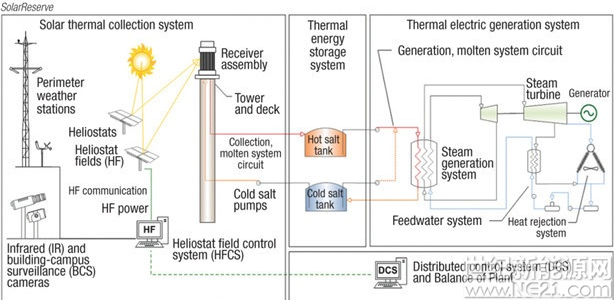 SolarReserve的塔式光熱發(fā)電技術便采用熔鹽進行儲熱,由硝酸鈉和硝酸鉀組成的混合物被作為電站的傳儲熱介質。熔鹽泵將熔融鹽(300℃)泵到高約164米左右的吸熱塔頂端的吸熱器中,而吸熱器用集中的太陽輻射熱量將熔鹽加熱到約565℃。約27215噸的熔融鹽被密封存儲在不銹鋼罐中,這樣可以更好地實現(xiàn)儲熱。