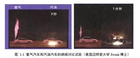 通常情況下,氫的密度僅為空氣的7%(一個標準大氣壓下,0℃下,密度為0.0899g/L),與汽油、丙烷和天然氣相比,具有更大的浮力(快速上升)、擴散性(橫向移動)和快速揮發性??諝庵泻茈y聚集高濃度的氫,如果發生泄漏,氫氣會迅速擴散,特別是在開放環境中,很容易快速逃逸,而不像汽油揮發后滯留在空氣中不易疏散。美國邁阿密大學的Swain博士做過一個著名的試驗,如圖1-1所示。兩輛汽車分別用氫氣和汽油作燃料,然后進行泄漏點火試驗。點火3秒后,高壓氫氣產生的火焰直噴上方,汽油則從汽車的下部著火;到1分鐘時,用氫氣作燃料的汽車只有漏出的氫氣在燃燒,汽車沒有大問題,而汽油車則早已成為大火球,完全燒光。所以氫氣易揮發的性質,與普通汽油車相比,有利于汽車的安全。