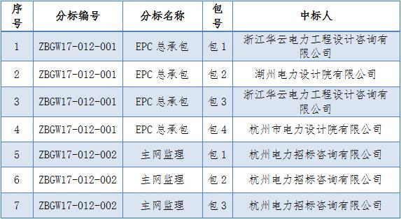 國網(wǎng)浙江省電力公司2017年新能源光伏項目配套工程服務(wù)類招標(biāo)采購的評標(biāo)工作已結(jié)束。根據(jù)經(jīng)評標(biāo)委員會的評審結(jié)果,經(jīng)招標(biāo)領(lǐng)導(dǎo)小組批準(zhǔn),各標(biāo)包的中標(biāo)情況如下: