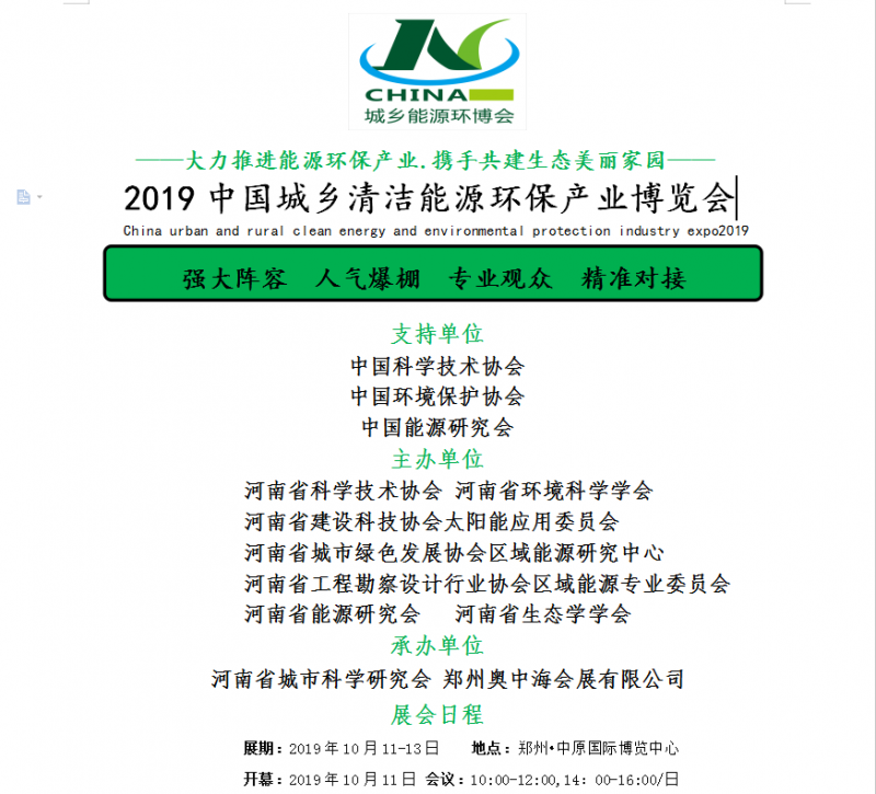 2019中國城鄉清潔能源環保產業展,強勢回歸,在中國·鄭州10月盛大開幕,得到了中國科學技術協會、中國環境保護協會、中國能源研究會、河南省科學技術協會、河南省環境科學學會、河南省建設科技協會等單位重點支持、主辦,以及廣大知名企業和經銷商的支持和積極響應。大會立足中部輻射全國,總面積達20000余平米,專業觀眾30000余人,屆時聚千家國內外知名企業歡聚一堂,百余家媒體海量宣傳報道,打造具有“中國特色”高標準、高品質、高規格”的行業盛會。