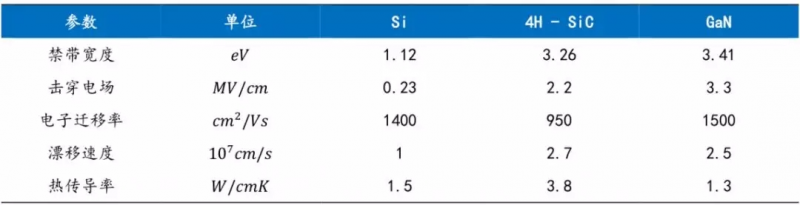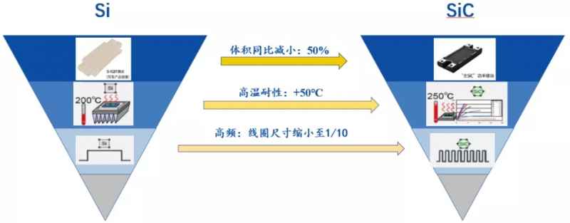 以碳化硅為代表的第三代半導體具備高禁帶寬度、高熱導率、高擊穿場強、高電子飽和漂移速率等優勢,其耐高壓能力是硅的10倍、耐高溫能力是硅的2倍、高頻能力是硅的2倍。可開發出更適應高溫、高功率、高壓、高頻以及抗輻射等惡劣條件的功率產品,可有效突破傳統硅基功率半導體器件及其材料的物理極限。