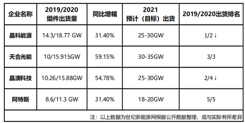 組件巨頭年報(bào)紛紛發(fā)布,隆基雖然年報(bào)數(shù)據(jù)仍未披露,但在2020年年底,其公布2020年組件出貨量達(dá)20GW+,相較于2019年8.4GW組件出貨量,增長138%+。從全球第四位躍居榜首。