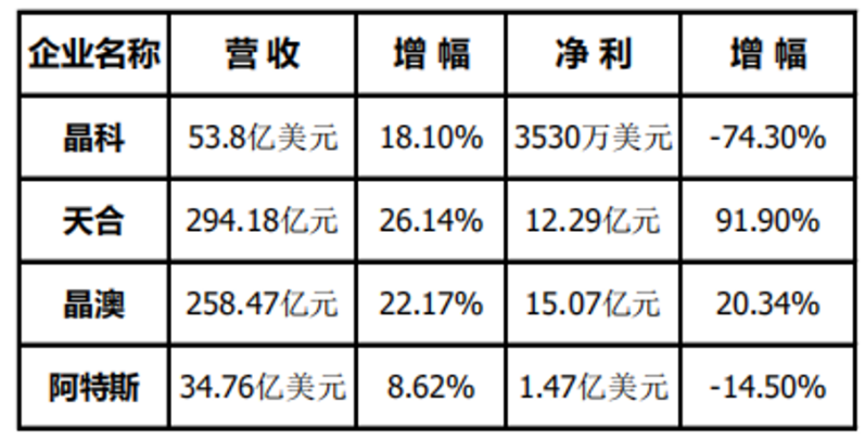 從晶科、天合、晶澳、阿特斯年報(bào)不難發(fā)現(xiàn),各家營收額全面上浮。晶科營收晶科營收53.8億美元(約合352.6億元人民幣),同增18.10%;天合營收294.18億,同增26.14%;晶澳營收258.47億,同增22.17%;阿特斯?fàn)I收34.76億美元(約合227.5億元),同增8.62%。