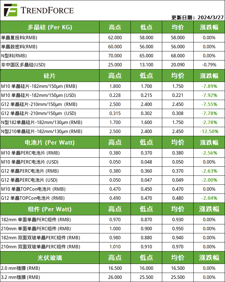光伏產業鏈價格周報:單晶硅片全面續跌 光伏組件繼續維穩(2024.3.27)