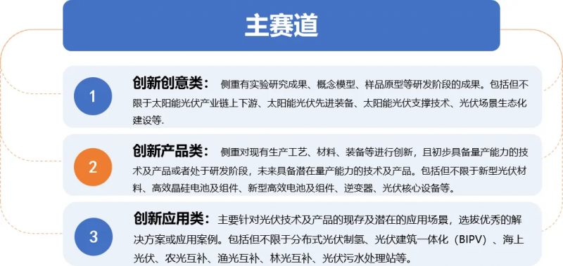 本次大賽結合第一屆大賽的反饋建議,特別設置了創新創意類、創新產品類、創新應用類以及專題比賽類四大板塊,涵蓋了從基礎研究到產業應用的全方位創新。無論你是對光伏材料有獨到見解的科研人員,還是手握高效電池技術的創業先鋒,亦或是致力于光伏應用場景創新的實踐者,都能在這里找到屬于你的舞臺。