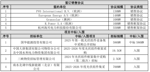 近期,公司組件業務實現大型銷售協議簽署及主要項目中標/入圍情況披露如下: