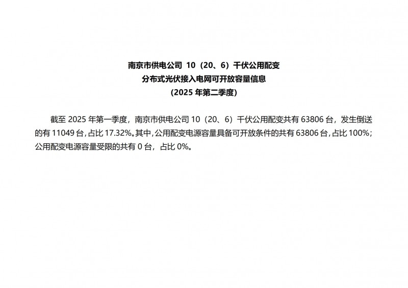 根據(jù)《國家能源局關(guān)于印發(fā)〈分布式光伏發(fā)電開發(fā)建設(shè)管理辦法〉的通知》(國能發(fā)新能規(guī)〔2025〕7號)《江蘇省發(fā)展改革委江蘇能源監(jiān)管辦關(guān)于貫徹落實(shí)〈分布式光伏開發(fā)建設(shè)管理辦法〉的實(shí)施意見》(蘇發(fā)改規(guī)發(fā)〔2025〕2號)等文件要求,我委組織國網(wǎng)南京供電公司動態(tài)測算分布式光伏接入電網(wǎng)可開放容量,現(xiàn)將測算結(jié)果(數(shù)據(jù)截至2025年3月31日)向社會公開。