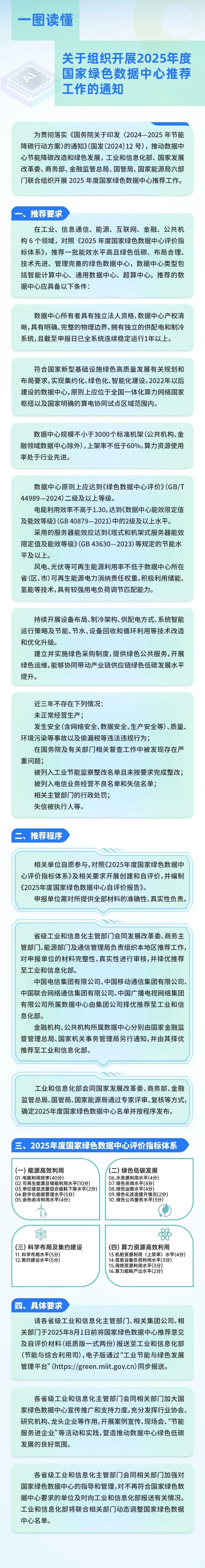 為貫徹落實《國務院關于印發〈2024—2025年節能降碳行動方案〉的通知》(國發〔2024〕12號),推動數據中心節能降碳改造和綠色發展,現組織開展2025年度國家綠色數據中心推薦工作。有關事項通知如下: