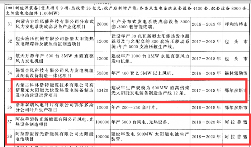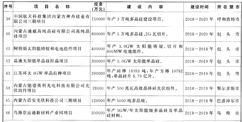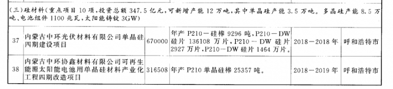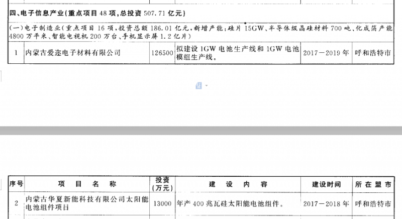 近日,內(nèi)蒙古自治區(qū)印發(fā)了《內(nèi)蒙古自治區(qū)人民政府關(guān)于印發(fā)自治區(qū)新興產(chǎn)業(yè)高質(zhì)量發(fā)展實(shí)施方案(2018—2020年)的通知》,該文件的項(xiàng)目匯總中,以中環(huán)、通威、協(xié)鑫、阿特斯、晶澳等為代表的光伏名企紛紛布局了單、多晶硅項(xiàng)目以及高效電池片,總投資達(dá)到近500億元左右;與此同時(shí),這部分企業(yè)也將獲得內(nèi)蒙自治區(qū)的資金獎(jiǎng)勵(lì),最高不超過(guò)500萬(wàn)元。