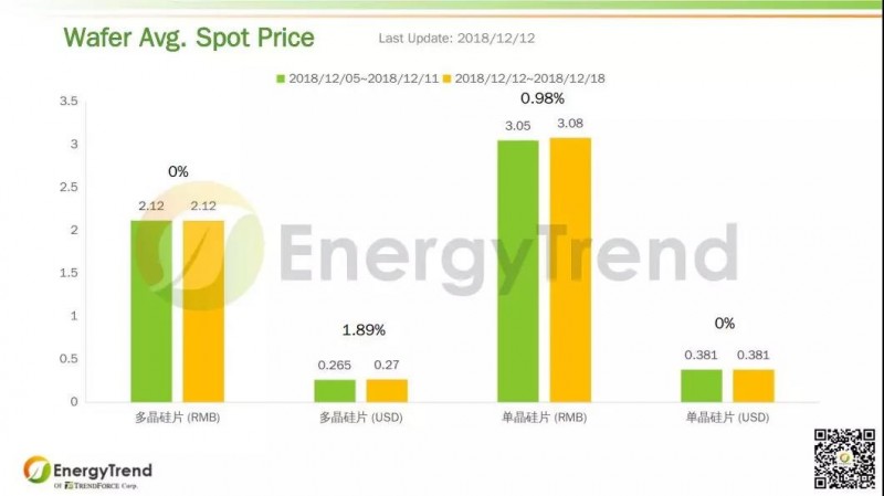 12月12日的報價顯示電池片海外市場行情見張。常規多晶電池片人民幣價格維持在 RMB0.86/W 不變;美金價格從 US$0.103/W 來到 US$0.109/W,增長了 5.83%。常規單晶電池片的人民幣均價為 RMB1.04/W,與上周持平;美金均價上漲了 20%,去至 US$0.15/W。高效單晶電池片人民幣報價也保持不變,為 RMB1.16/W;其先前的美金報價為 US$0.165/W,最新一周增長了 1.82% 來到 US$0.168/W。特高效單晶電池片的人民幣和美金價格均保持不變,分別為 RMB1.25/W 和 US$0.175/W。