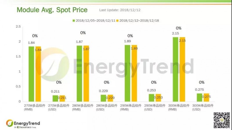 在最新一期報價中,光伏組件產品市場相對穩定,所有產品的均價都保持不變。270W多晶組件的人民幣報價和美金報價分別為 RMB1.84/W 和 US$0.211/W。280W多晶組件兩個幣種報價分別為 RMB1.87/W 和 US$0.229/W。290W單晶組件人民幣和美金最新報價分別為 RMB1.89/W 和 US$0.253/W。300W單晶組件的人民幣報價和美金報價依舊為 RMB2.13/W 和 US$0.275/W。