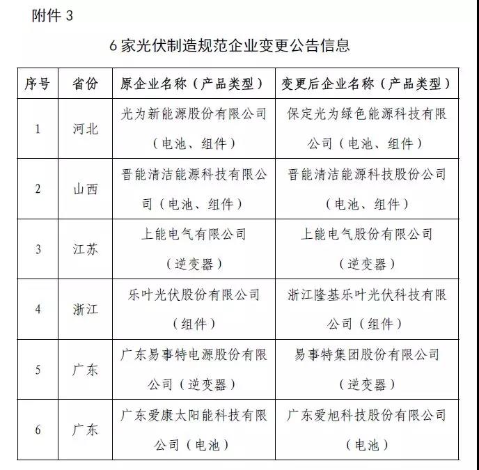 3、6家光伏制造規(guī)范企業(yè)變更公告信息