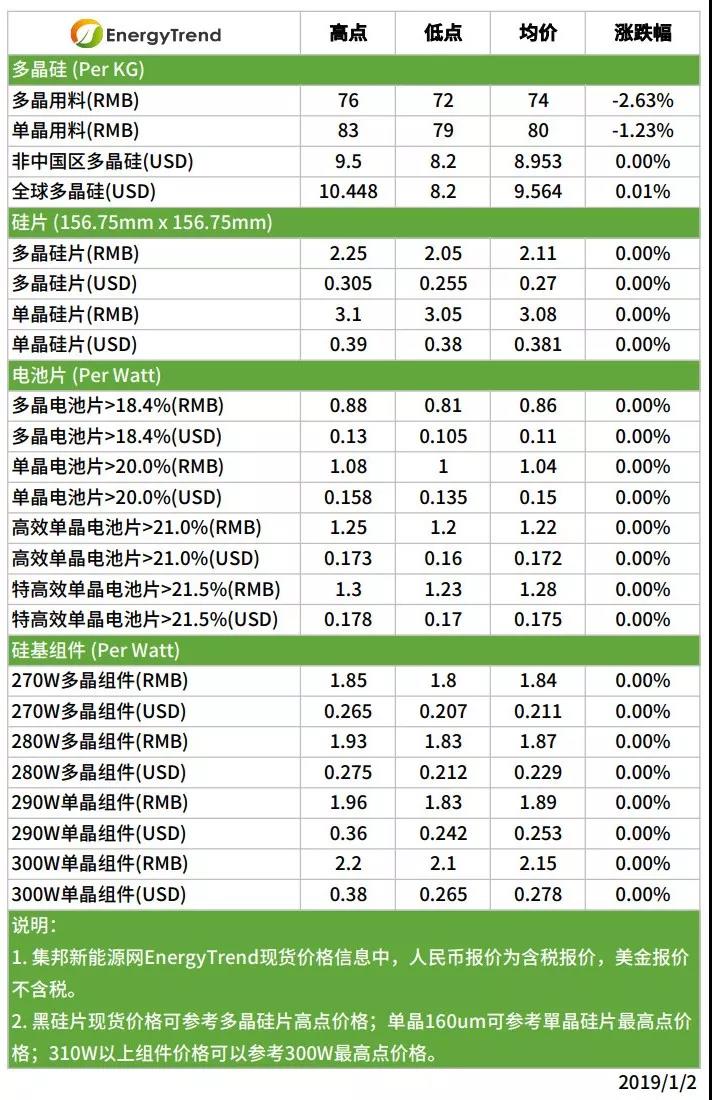 受到海外假期與中國國內階段性標案結束,本周組件市場的氣氛明顯放緩。目前中國國內一般多晶 (270W——275W) 組件價格維持在1.80——1.85RMB/W,高效多晶(280——285W) 組件價格維持在1.83——1.93RMB/W,一般單晶(290——295W) 組件價格維持在1.83——1.96RMB/W,高效單晶(300——305W) 組件價格維持在2.1——2.20RMB/W,特高效單晶(>310W) 組件價格維持在2.23RMB/W的價位。海外一般多晶組件價格維持在0.207——0.265USD/W,高效多晶組件價格維持在0.212——0.275USD/W,一般單晶組件價格維持在0.242——0.36USD/W,高效單晶組件價格維持在0.265——0.38USD/W。