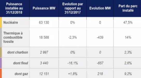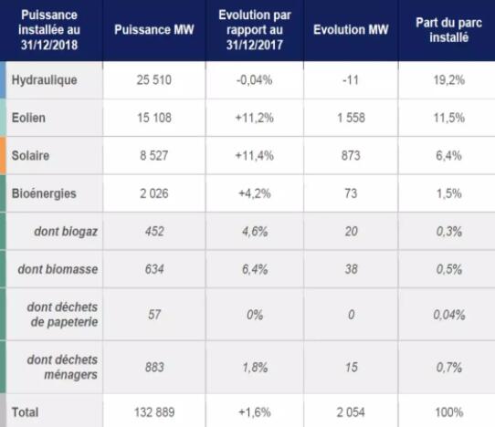 根據(jù)法國國家電網(wǎng)RTE最新發(fā)布的統(tǒng)計數(shù)據(jù),2018年底法國本土發(fā)電裝機容量為132.889吉瓦,其中核電63.130吉瓦(47.5%)、水電25.510吉瓦(19.2%)、風(fēng)電15.108吉瓦(11.5%)、天然氣電12.151吉瓦(9.2%)、太陽能發(fā)電8.527吉瓦(6.4%)、燃油發(fā)電3.440吉瓦(2.6%)、煤電2.997吉瓦(2.3%)、生物質(zhì)發(fā)電2.026吉瓦(1.5%)。