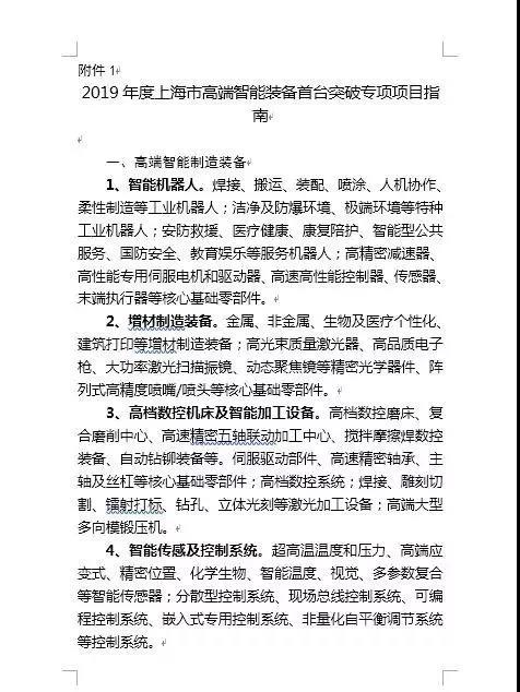 2019年度上海市高端智能裝備首臺突破專項項目申請指南