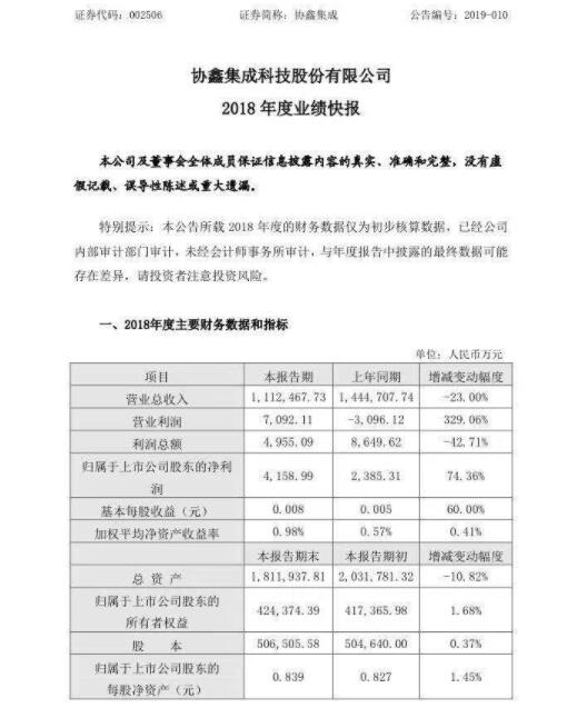 2月19日,協鑫集成(002506)公布2018年度業績快報,實現營業總收入1112467.73萬元,較上年同期減少23.00%;實現營業利潤7092.11萬元,較上年同期增長329.06%;實現歸屬于上市公司股東的凈利潤4158.99萬元,較上年同期增長74.36%。