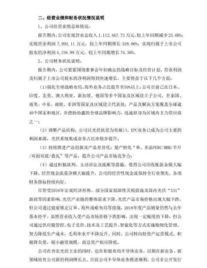 協鑫集成表示,公司積極應對國內外經濟環境影響,特別是光伏“531”新政等因素影響,通過提前鎖定訂單、海外戰略布局等措施,2018年度產品銷量仍然與去年基本持平。雖然營業收入受產品市場價格下跌影響,出現一定幅度的下降,但公司通過供應鏈管控、電子競價、技術及工藝提升、智能化等方式實施精細化管理,努力降低生產成本,毛利率水平不降反升。同時,公司轉向輕資產運營模式,積極降負債,縮小融資規模,故總資產相應降低。