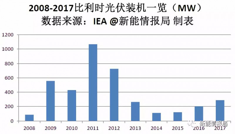 從下圖可以看出,比利時裝機在2011年達(dá)到頂峰,當(dāng)年裝機約為1.068GW,此后一路下滑,直到2016年才開始又有了較為明顯的上升。