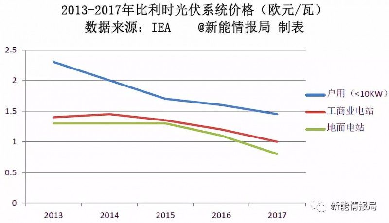 比利時的光伏裝機中戶用和工商業(yè)屋頂占據(jù)了絕大部分比例,其中光伏系統(tǒng)的價格變化趨勢如下: