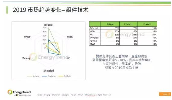 組件方面,雙面組件技術工藝簡單,量產難度低,發電量增益可達5~30%,且成本機無增加,在高效組件中降本能力最強,可望在2019年成為主流。