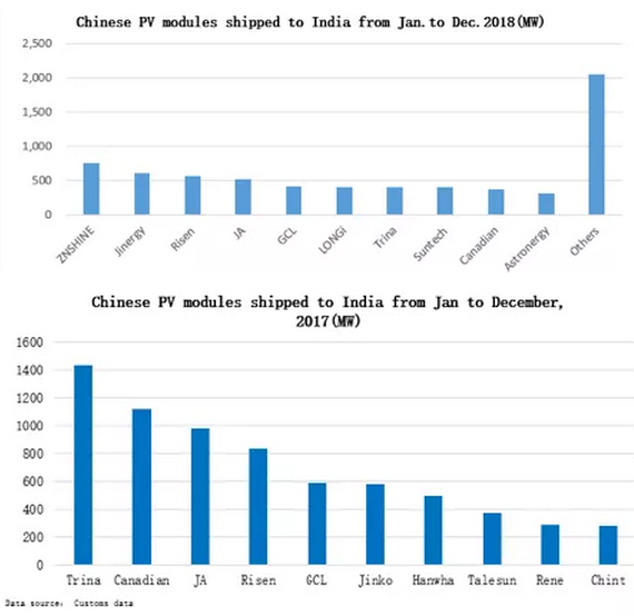 根據海關統(tǒng)計數據,2017年和2018年印度市場上前十大光伏組件企業(yè)的“大變臉”也印證了上述變化。