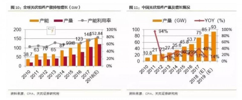 據CPIA統計,2018年全球組件產能達到152.8GW左右(根據觀研天下整理CPIA數據),中國組件產量為85.7GW,同比增長14.3%,預計2019年可達到93GW。