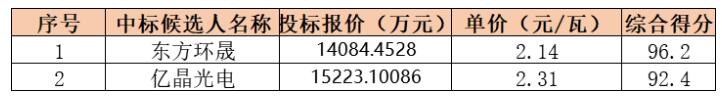 最終東方環晟光伏(江蘇)有限公司以總報價14084.4528萬元、單價2.14元/瓦的價格位列第一中標候選人,供貨期為2019年5月5日至7月20日分批交貨。具體如下: