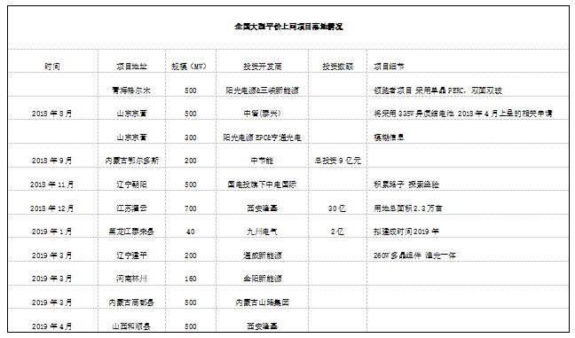 從表中信息我們可以看出,已公示的無補貼項目主要集中在2018年第四季度和2019年第一季度,除去第一個青海格爾木領跑者項目,目前已累計3.6GW。項目集中分布在山東、山西、內蒙古、江蘇、遼寧等幾大省份,投建者中隆基表現突出,兩個項目規模共計1.2GW。