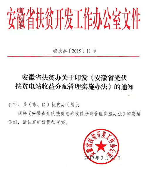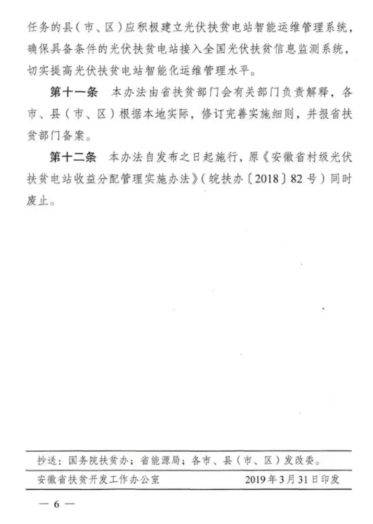 2019年3月31日,安徽扶貧辦印發新版扶貧管理辦法,原 皖扶辦〔2018〕82號《安徽省扶貧辦關于印發《安徽省村級光伏扶貧電站收益分配管理實施辦法》的通知》已廢止。