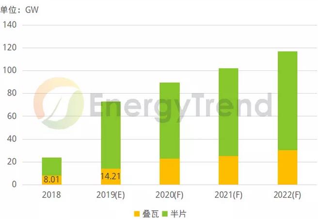 圖:2018年——2022年疊瓦與半片組件的產能預測
