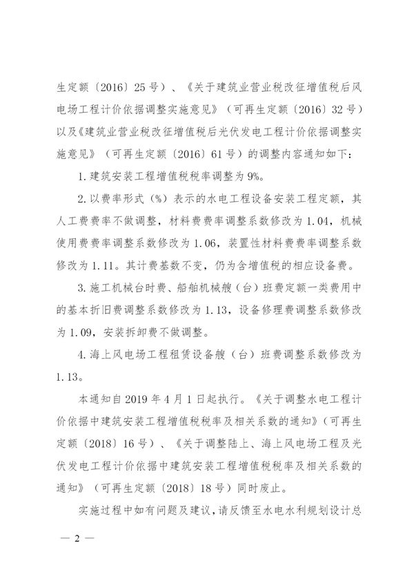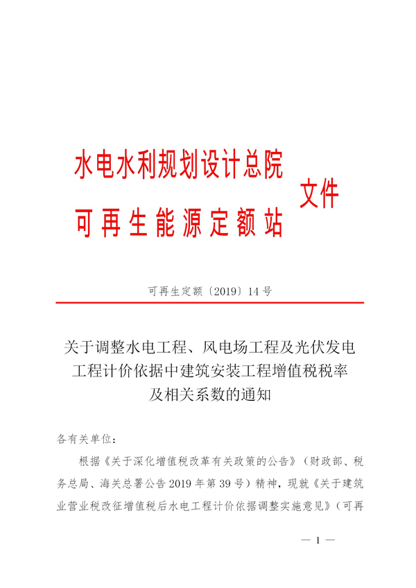 近日,水電水利規(guī)劃設(shè)計總院可再生能源定額站發(fā)布《關(guān)于調(diào)整水電工程、風(fēng)電場工程及光伏發(fā)電工程計價依據(jù)中建筑安裝工程增值稅稅率及相關(guān)系數(shù)的通知》。本通知自2019年4月1日起執(zhí)行。