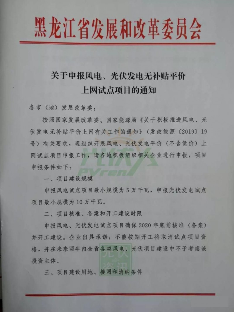 從黑龍江發(fā)改委官網(wǎng)了解到,黑龍江發(fā)改委發(fā)布《關(guān)于申報(bào)風(fēng)電、光伏發(fā)電無(wú)補(bǔ)貼平價(jià)上網(wǎng)試點(diǎn)項(xiàng)目的通知》,要求平價(jià)光伏發(fā)電試點(diǎn)項(xiàng)目最小規(guī)模為100兆瓦,這也是首個(gè)對(duì)平價(jià)上網(wǎng)項(xiàng)目容量進(jìn)行要求的省份。黑龍江的平價(jià)上網(wǎng)光伏政策對(duì)其他省份也有參考意義。