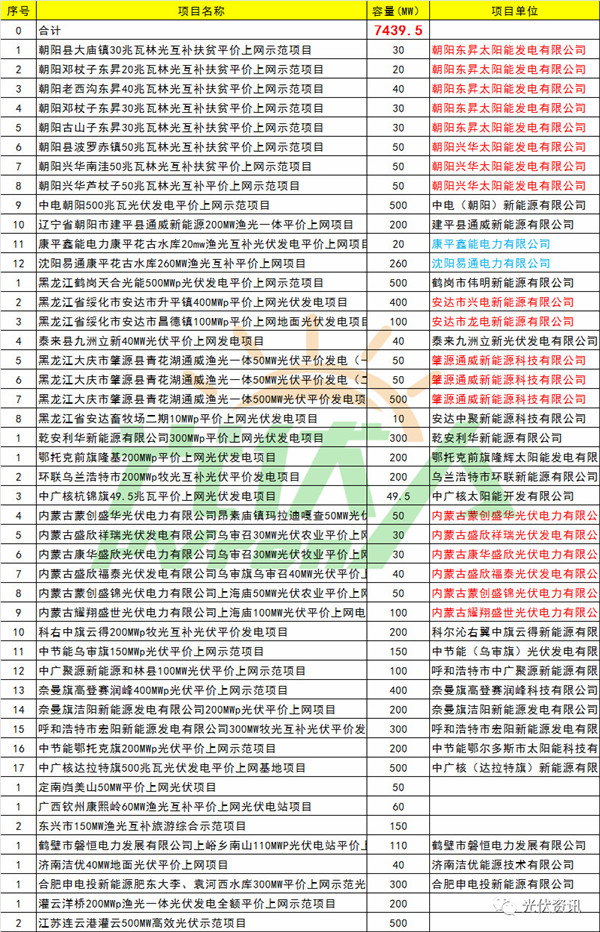 各地政府及企業積極準備,近日筆者整理了部分平價上網項目名單,供光伏人參考。目前可查詢到的已備案項目一共有7.44GW,其中內蒙古2.8GW,黑龍江1.65GW,遼寧1.28GW,山西、河南、河北等光伏大省尚未公開查詢到相關信息。