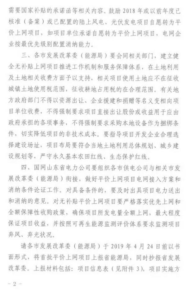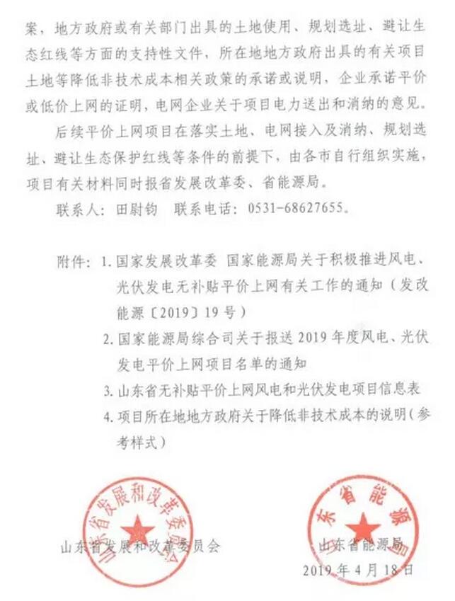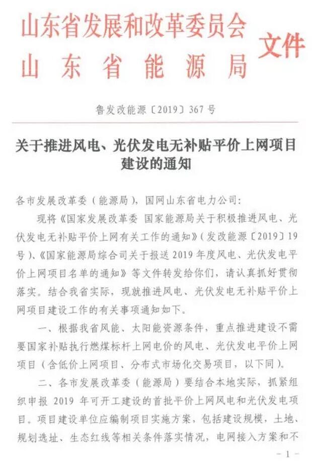 4月18日,山東省發展和改革委員會和山東省能源局聯合印發《關于推進風電、光伏發電無補貼平價上網項目建設的通知》。