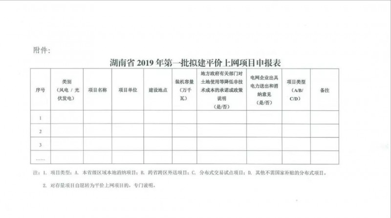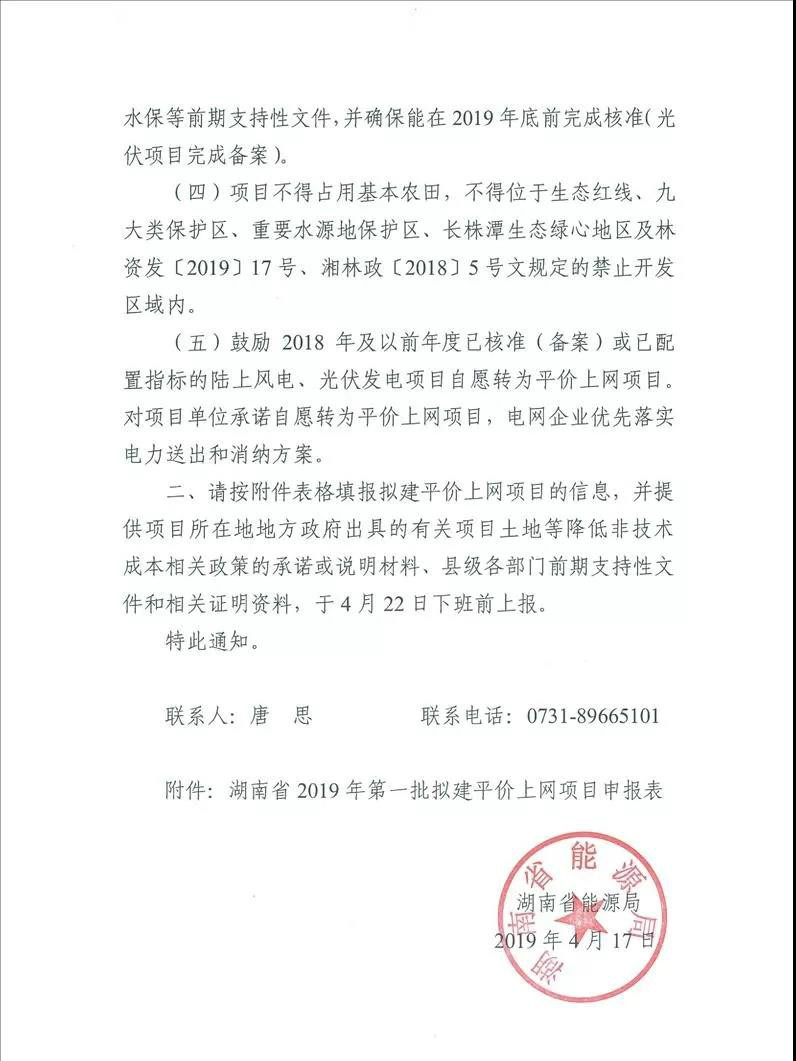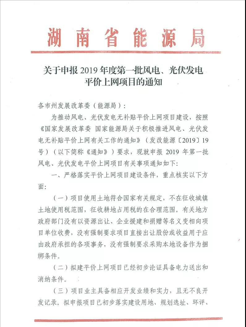 湖南省能源局關(guān)于申報2019年度第一批風電、光伏發(fā)電平價上網(wǎng)項目的通知。