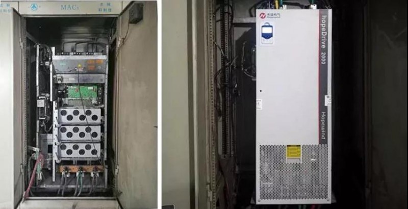 該高爐卷揚設備電機原使用某國際品牌6se70系列400kW變頻器驅動,由于長時間使用,設備故障率高且缺乏備件,嚴重影響生產。此次采用禾望變頻器進行替換改造,無需更換上位機代碼、柜體結構、主功率走線等情況下,于一天內實現無縫替換。完美適應高爐卷揚的高啟動轉矩、嚴格的啟停速度與位置、高穩定性等要求,順利地進行了焦炭、礦物等不同負重(輕載、重載、過載)以及高低速運行等工況測試,同時在機械抱閘裝置出現故障能夠及時保護避免溜車,得到了領域專家的高度肯定。