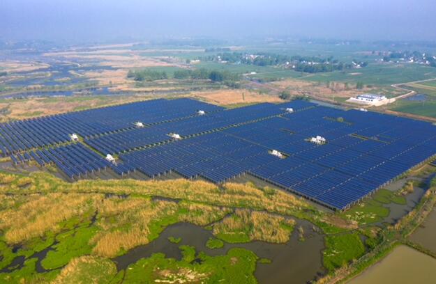 4月19日,位于安徽省固鎮(zhèn)縣王莊鎮(zhèn)釣魚(yú)臺(tái)村釣魚(yú)湖周邊密密麻麻的光伏太陽(yáng)能電池板正在“收集”陽(yáng)光,通過(guò)航拍鏡頭可以看到,電池板在陽(yáng)光的照射下閃閃發(fā)光。據(jù)了解,該項(xiàng)目位于固鎮(zhèn)縣王莊鎮(zhèn)釣魚(yú)臺(tái)湖灘涂地,占地面積600畝,項(xiàng)目總投資約2億元,釣魚(yú)臺(tái)湖漁光互補(bǔ)光伏發(fā)電項(xiàng)目總裝機(jī)容量是20兆瓦,使用多晶硅電池組件77000多塊,采用分塊發(fā)電、集中并網(wǎng)方案,所發(fā)電量全額并入公共電網(wǎng)。電站運(yùn)營(yíng)期內(nèi)平均年上網(wǎng)電量約為2370萬(wàn)度,每年僅發(fā)電一項(xiàng)就可產(chǎn)生效益2000多萬(wàn)元。作為全縣首個(gè)漁光互補(bǔ)項(xiàng)目,該項(xiàng)目利用現(xiàn)有灘涂地、湖面,上層發(fā)電,下層養(yǎng)殖,充分實(shí)現(xiàn)土地的綜合利用。