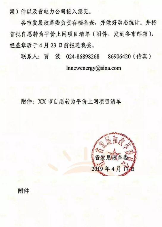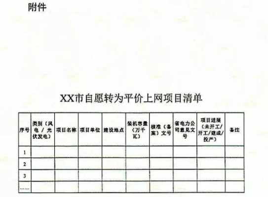 項(xiàng)目轉(zhuǎn)為平價(jià)上網(wǎng)項(xiàng)目的工作,其中2018年度及以前已核準(zhǔn)(備案)、已得到省電力公司接入意見的陸上風(fēng)電、光伏項(xiàng)目,項(xiàng)目業(yè)主可向市級發(fā)改委報(bào)送項(xiàng)目自愿轉(zhuǎn)為平價(jià)上網(wǎng)項(xiàng)目承諾書。各市發(fā)改委于4月23日前報(bào)送到省發(fā)改委。