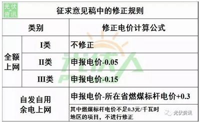 (1)普通光伏電站和全額上網工商業分布式光伏發電項目:II類資源區修正后的電價=申報電價-0.05元/千瓦時,III類資源區修正后的電價=申報電價-0.15元/千瓦時。