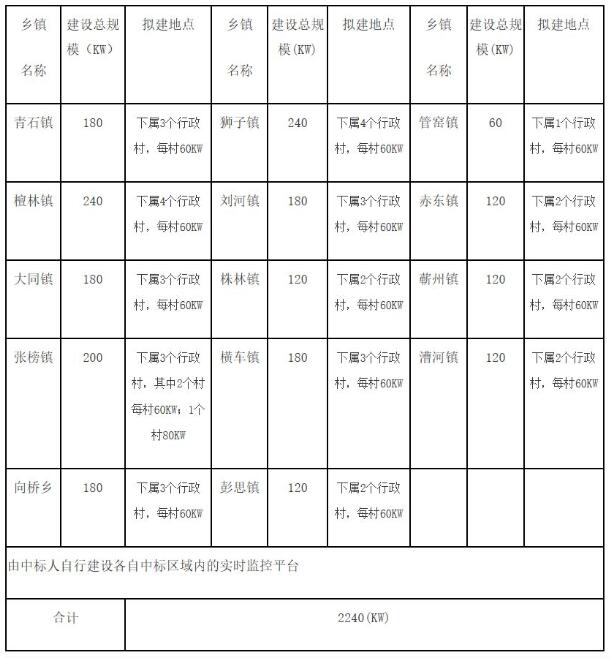 2019年度分別在全縣14個鄉鎮擬建設36個60KW、1個80KW村級光伏電站,要求利用地面或電網接入條件較好的荒山荒坡及灘涂地帶,建設總裝機規模為2.24MWP(具體詳見附表)。投標人須在中標后,建設其所中標區域內符合《村級光伏扶貧電站數據采集終端技術規范》(國開辦司函〔2019〕49號)文件的要求的實時監控平臺。