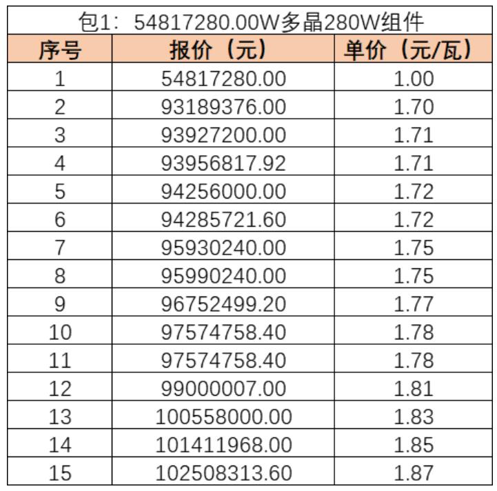 該項(xiàng)目組件交貨期為2019年7月-9月。據(jù)了解,其中,由湖南紅太陽(yáng)報(bào)出的最低價(jià)1元/瓦因信息填寫錯(cuò)誤已廢標(biāo)。去除該無(wú)效報(bào)價(jià)后,最低報(bào)價(jià)1.70元/瓦,最高報(bào)價(jià)1.87元/瓦,均價(jià)在1.76元/瓦左右。該價(jià)格為人民幣含稅價(jià)。