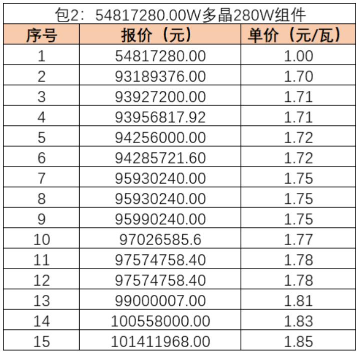 近日,中國(guó)能源工程股份有限公司匈牙利 Kaposvar 100MWp光伏電站的組件招標(biāo)項(xiàng)目開標(biāo),根據(jù)招標(biāo)公告,本次招標(biāo)分為2個(gè)包,組件要求為280Wp多晶硅組件,每個(gè)包包含54.8MWp組件(具體以實(shí)際采購(gòu)數(shù)量為準(zhǔn)),每個(gè)投標(biāo)人可以就一個(gè)包或多個(gè)包進(jìn)行投標(biāo),但只能成為一個(gè)包的中標(biāo)人。開標(biāo)價(jià)格如下: