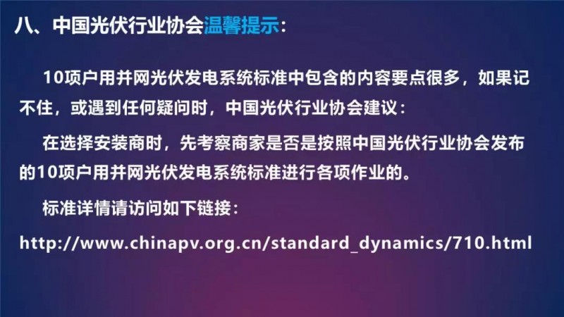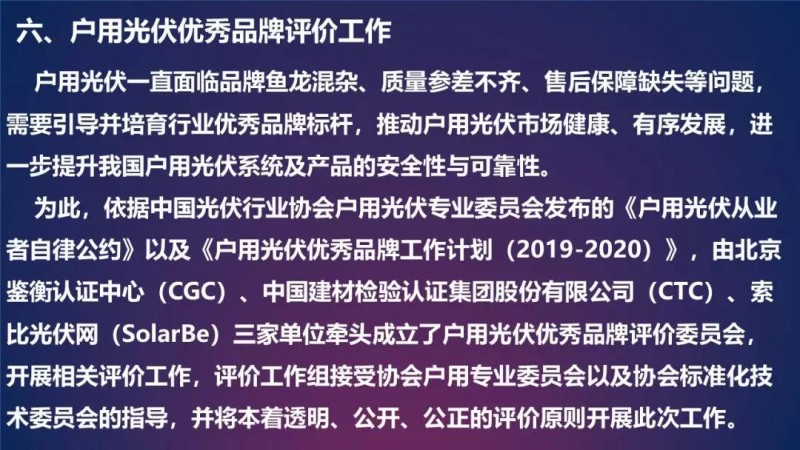 2019年4月30日國家發(fā)展改革委下發(fā)了《關(guān)于完善光伏發(fā)電上網(wǎng)電價(jià)機(jī)制有關(guān)問題的通知》,通知中明確了戶用分布式光伏的單獨(dú)電價(jià)政策,按照全發(fā)電量0.18元/度補(bǔ)貼。這意味著在全國大部分地區(qū),戶用光伏的收益率是有一定吸引力的。戶用光伏可以說是關(guān)系到千家萬戶的民生工程,不能有半點(diǎn)馬虎,因此質(zhì)量問題尤為關(guān)鍵。今年3月協(xié)會(huì)發(fā)布實(shí)施了10項(xiàng)中國光伏行業(yè)協(xié)會(huì)戶用光伏并網(wǎng)發(fā)電系統(tǒng)系列標(biāo)準(zhǔn)。